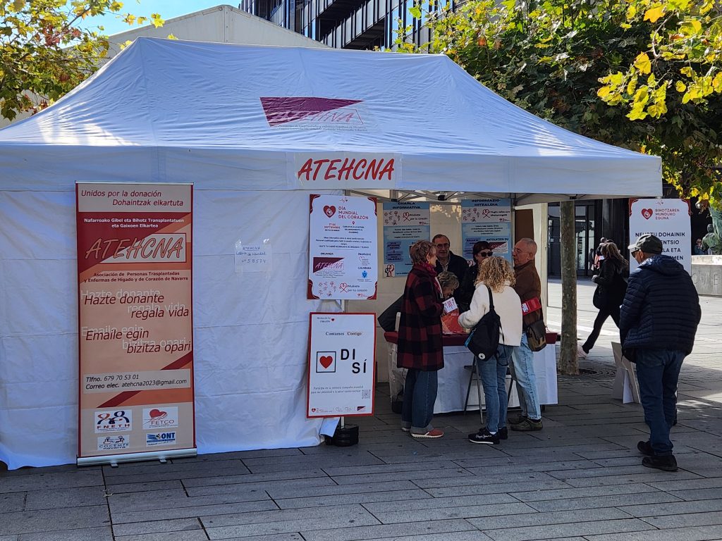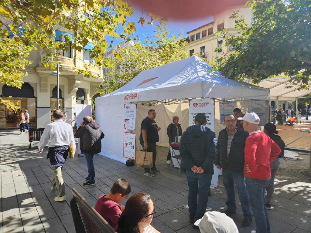 Carpa y mesa de la asociación, en Carlos III (al lado de le estatua del encierro), hicimos carnet de donante y toma de tensión y glucosa con la ayuda del Colegio de Enfermeras de Navarra, hicimos una rueda de prensa y reparto de propaganda.